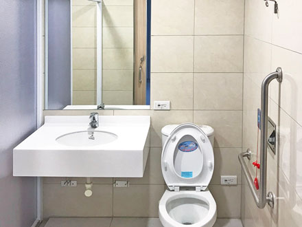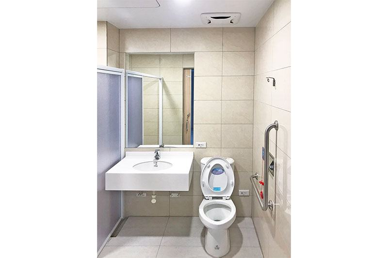 無障礙地坪、淋浴摺疊椅安全防跌、點滴掛勾、緊急求助鈴等等完善